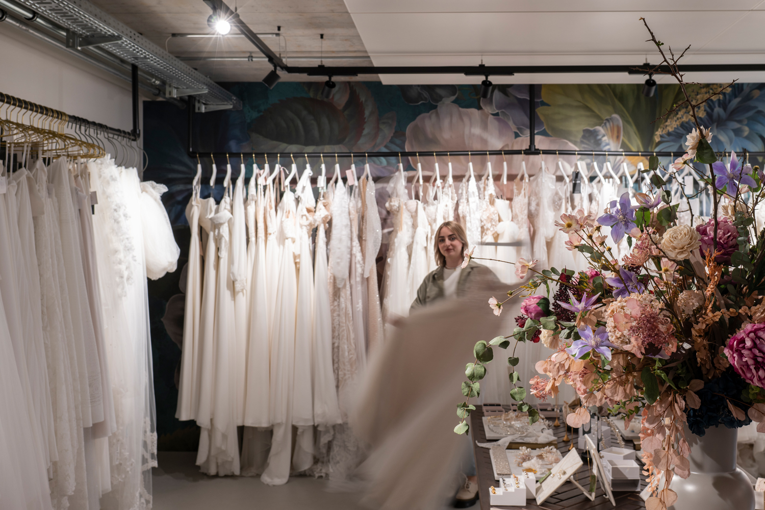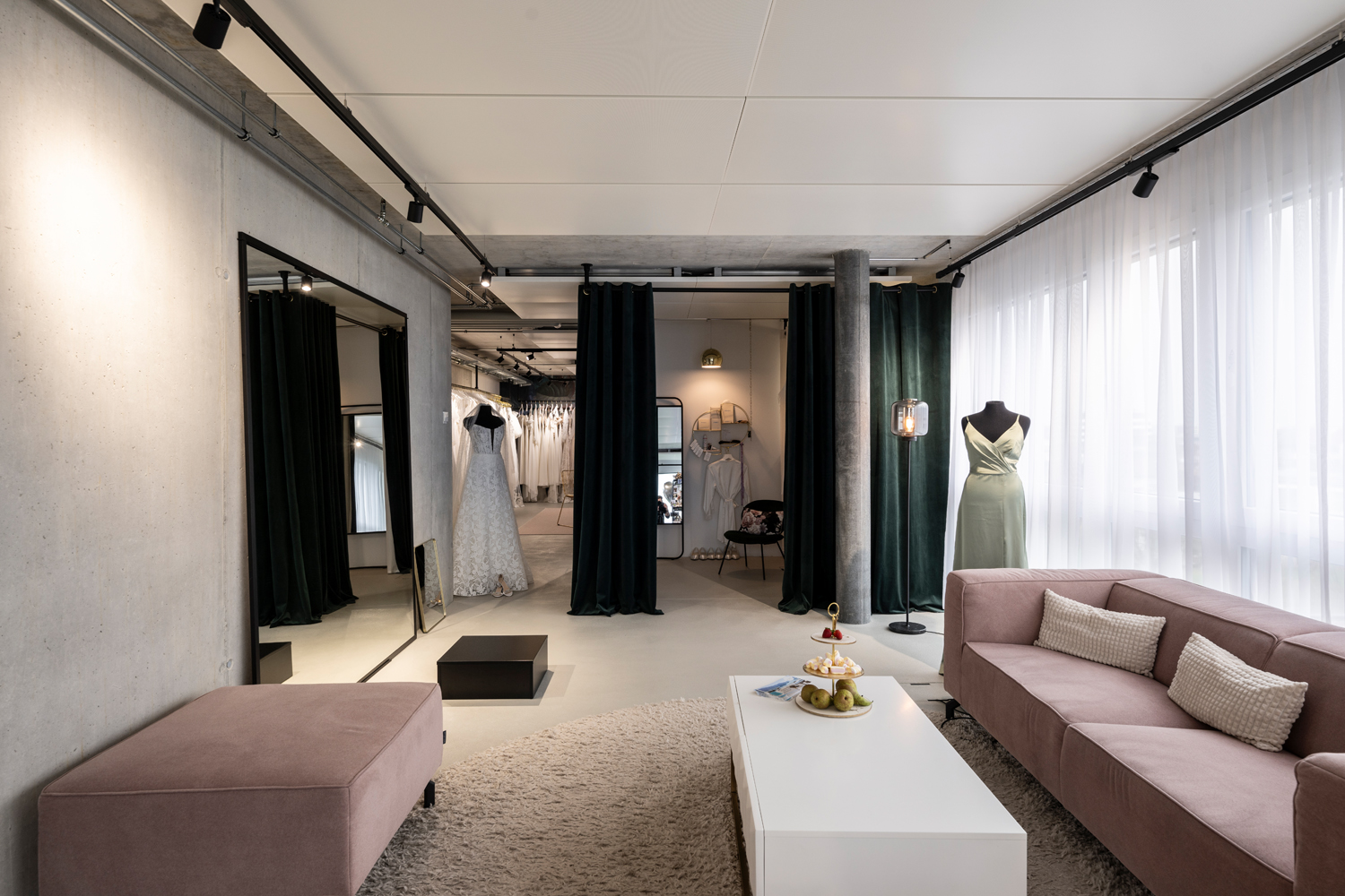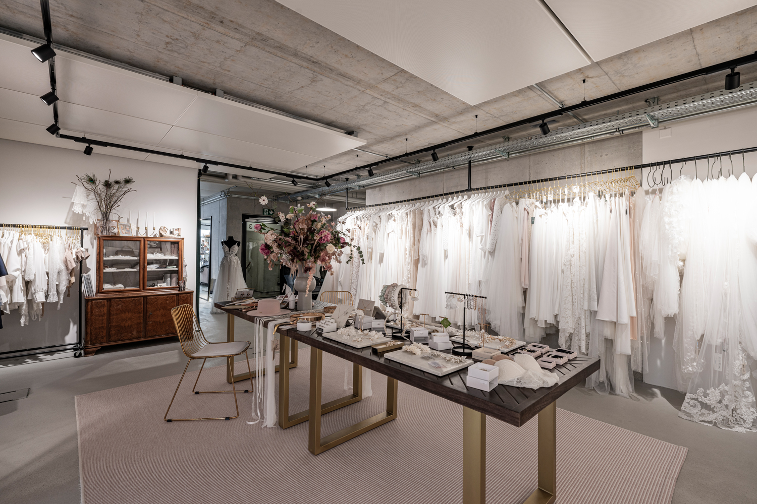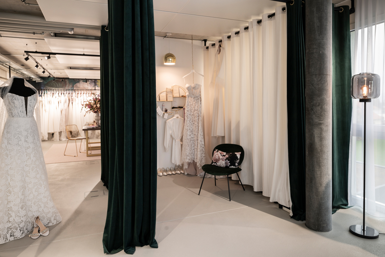 Der Showroom in der dritten Etage bietet viel Privatsphäre und einen umwerfenden Blick auf die Berge. Stylische Tapeten, die grosszügige Garderobe, die bequeme Sofalandschaft und der riesige Spiegel sorgen dafür, dass sich Braut und Begleitpersonen gleichermassen wohlfühlen.